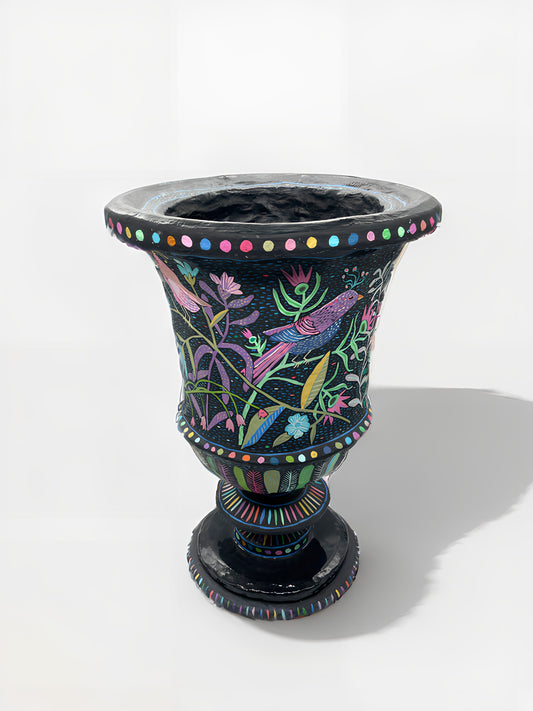 Hand-Painted Papier Mâché Urn with Floral and Avian Motif